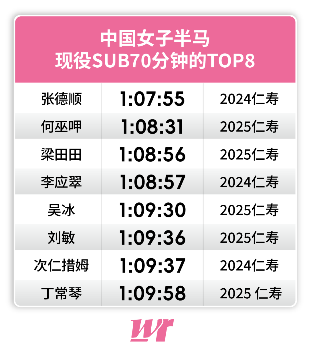 目前,国内女子半马打开70分大关的选手共有8位,此番仁寿,榜单上的一半女将都将聚首仁寿。