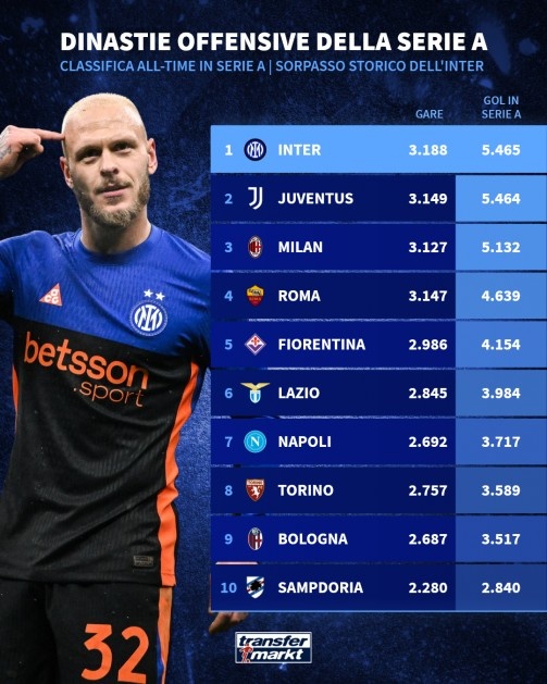 4月13日讯 德国转会市场统计了各队在意甲的历史进球总数量,并列出榜单,国米打进5465球,超越尤文居首。