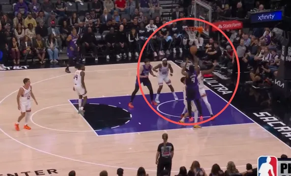 见雷诺抛投不中,阿丘瓦趁太阳篮下球员不备直接高高跃起,双手将球砸进篮筐,完成补扣。